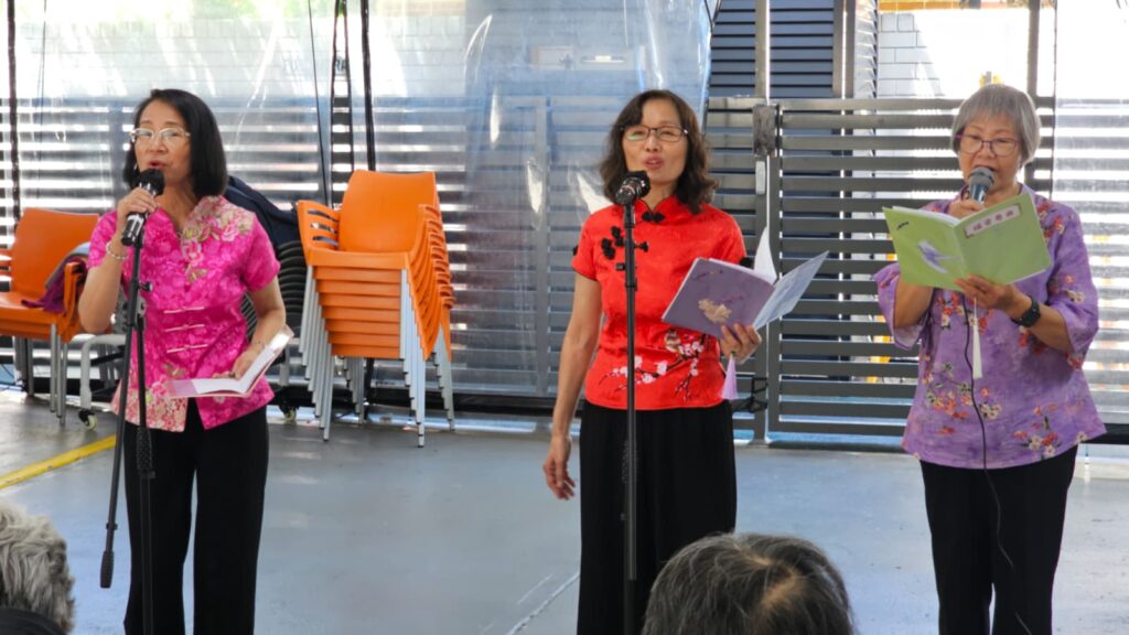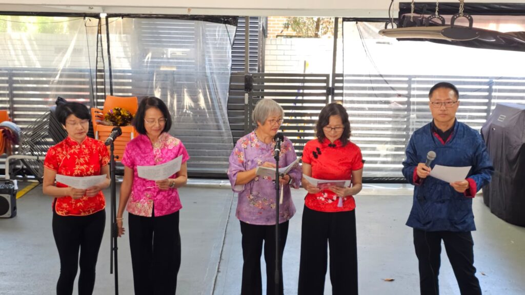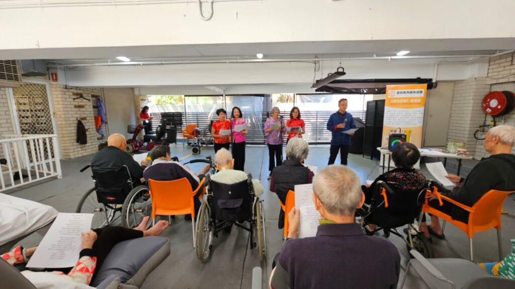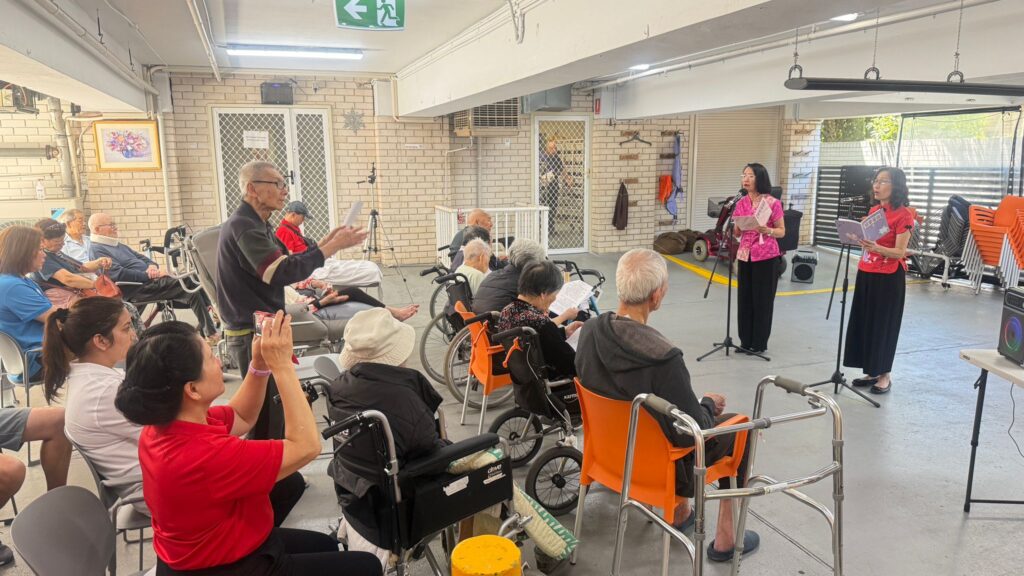 接著Earlwood的周藻泮療養院的探訪,團隊趁著不多的空檔時間,匆匆地用過簡單午餐後,探訪團隊馬不停蹄地趕往下一場報佳音活動 – Canterbury Place Care Community。這間安老院安排活動的地方是半開放的通風廊,出席活動的華人長者不多,但都願意投入每一個環節。首先由Day姊妹帶領熱身遊戲【新年吉慶齊賀歲】,然後由百思道讚美操小組獻上【新年心祝福】、【讓讚美飛揚】讚美操,長者們都又用心又用力的去讚美神。之後姊妹們為長者們獻唱悅耳的福音粵曲,包括【主恩福伴隨】、【樂享救恩】、【賀歲歌】。黃傳道分享的新春福音信息,以「馬」為主題,帶出耶穌與「馬」相關的,讓長者們明白神是「以馬內利」,親自願意與祂的子民同在的神。最後在一首輕鬆熱鬧的新春音樂陪伴下,透過新春禮物為長者們送上從神而來的祝福和祝賀。