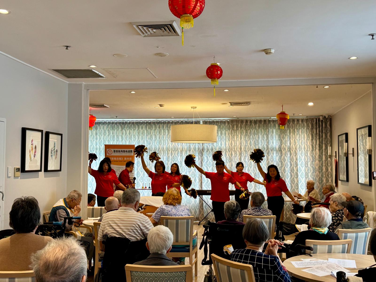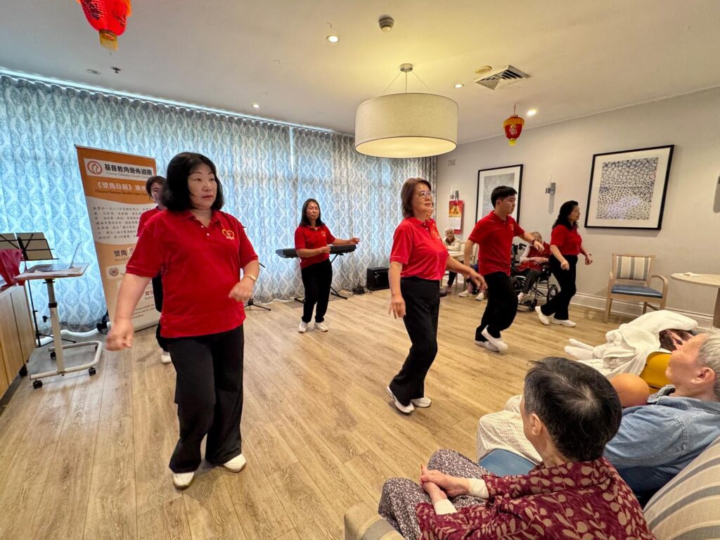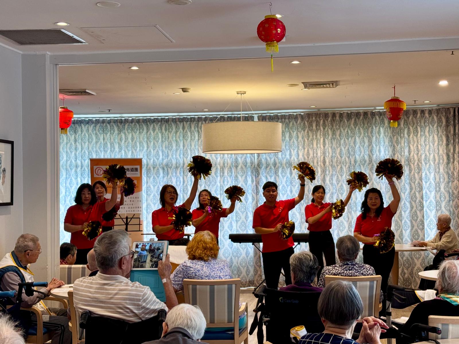2026年第五站的新春報佳音是位於Harris Park的Fairlea華人安老院。在探訪團隊到達之前,長者們已經預早安坐在大廳等待我們的到來。在團隊準備設備時,長者們還在陸陸續續來到,有些還熱情和主動的跟我們打招呼。這次參與探訪的單位,除了有基督教百思道華人公理會讚美操小組,天使樂團和Grace & Cedric外,也有第一次參與我們探訪的譚國雄傳道。