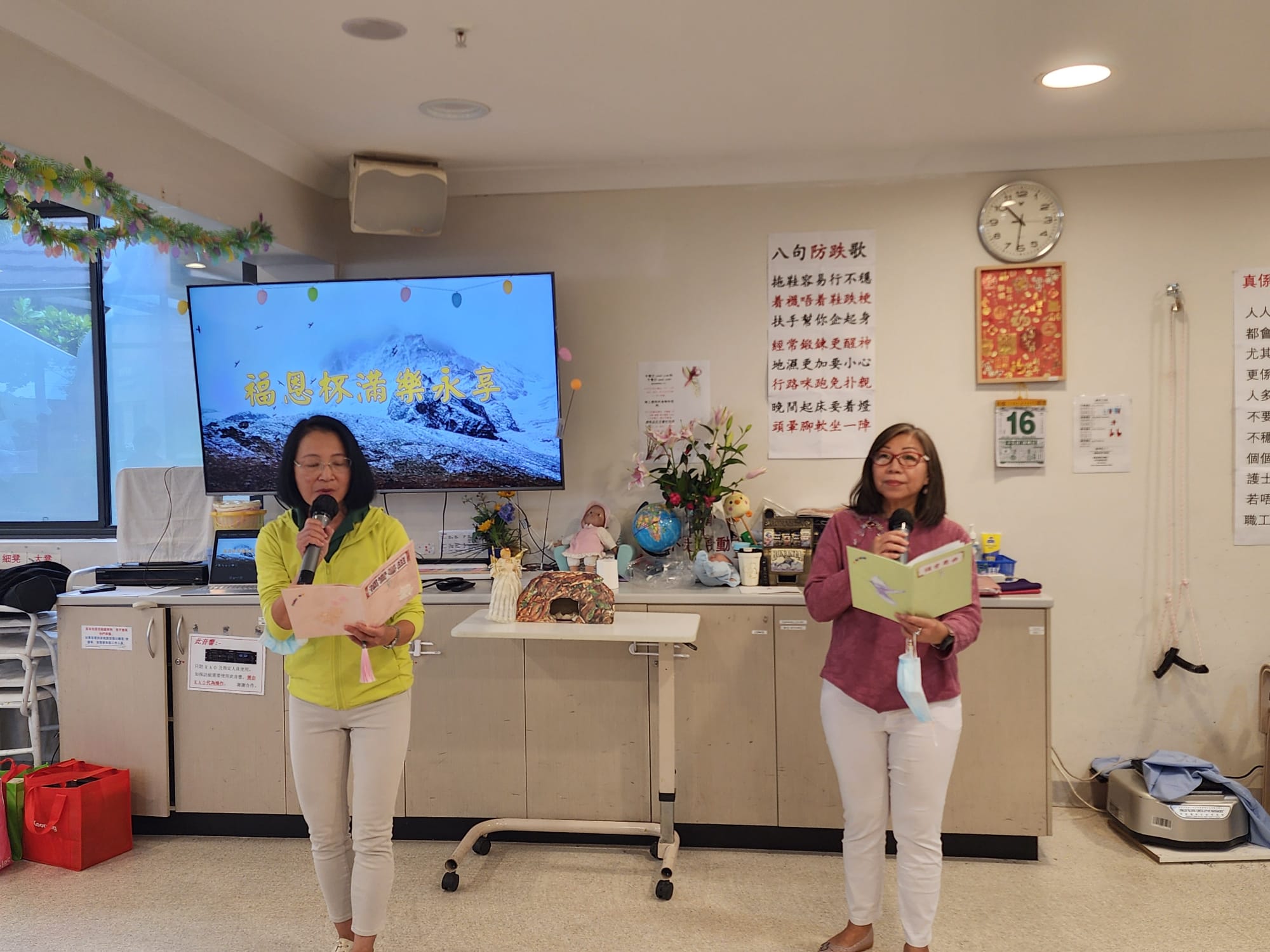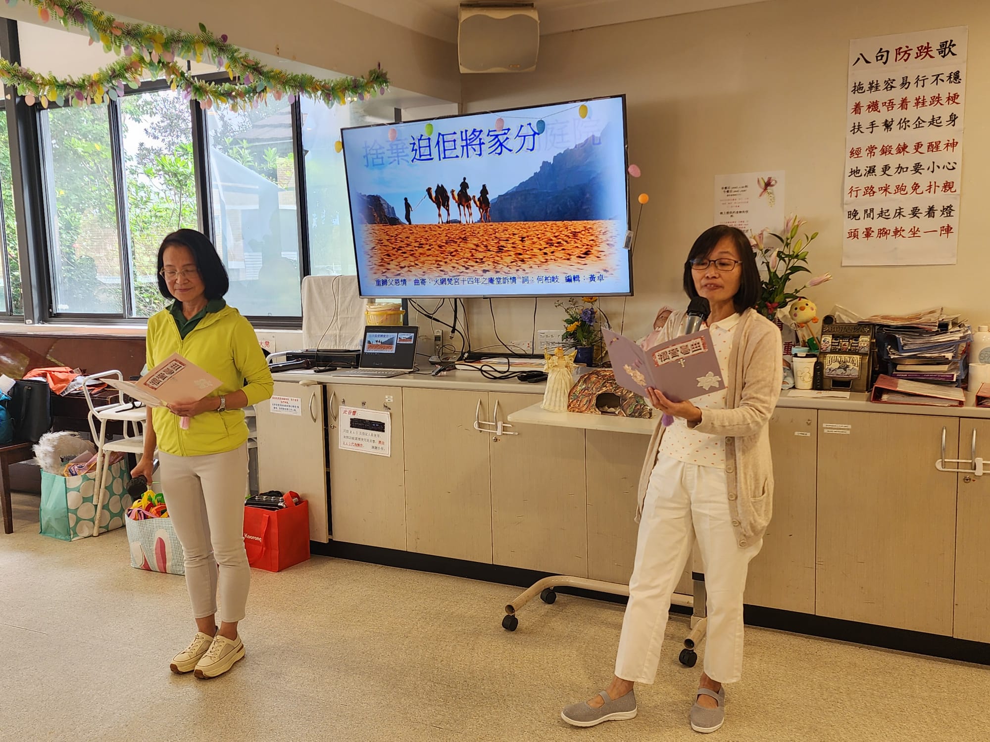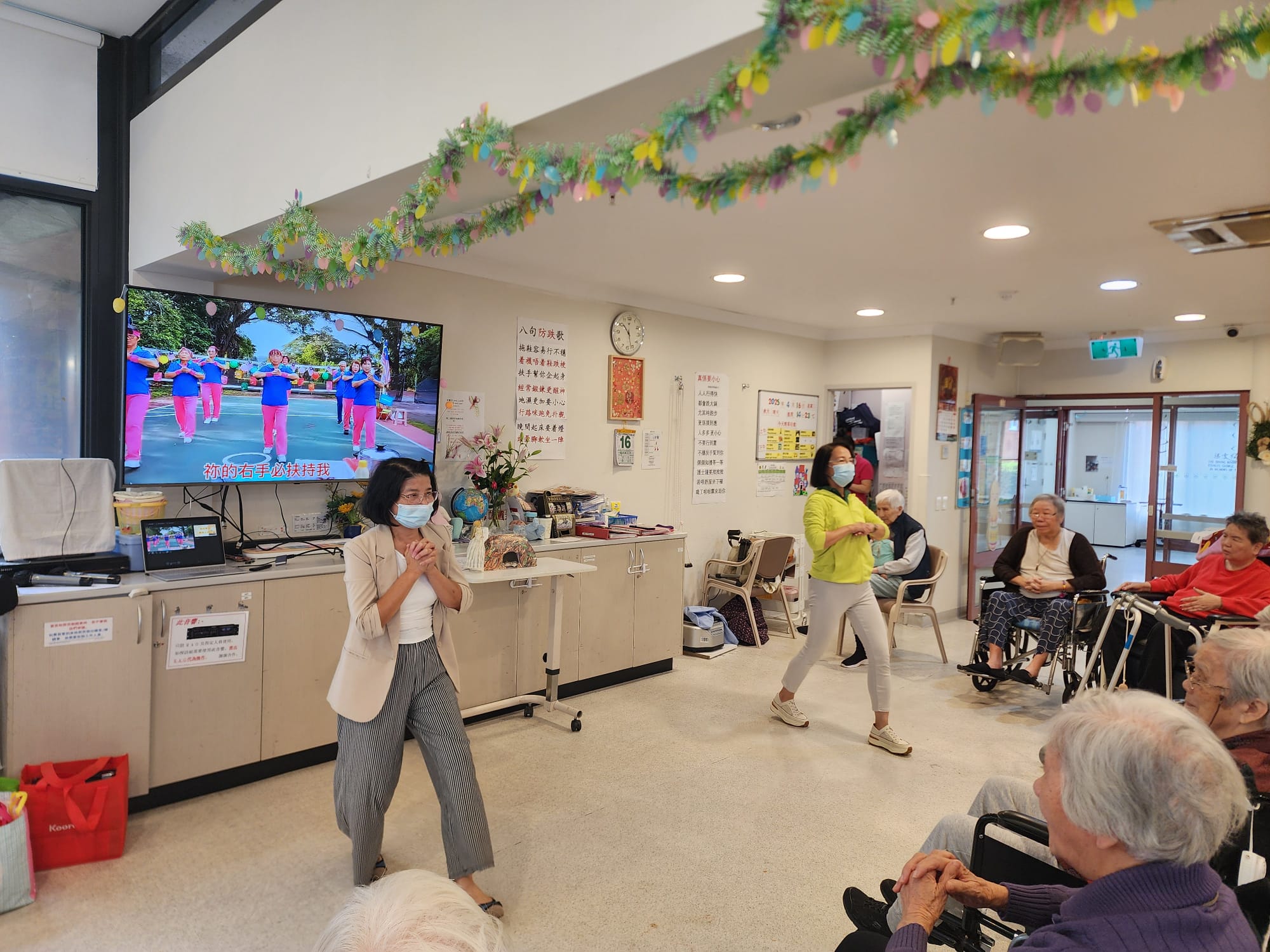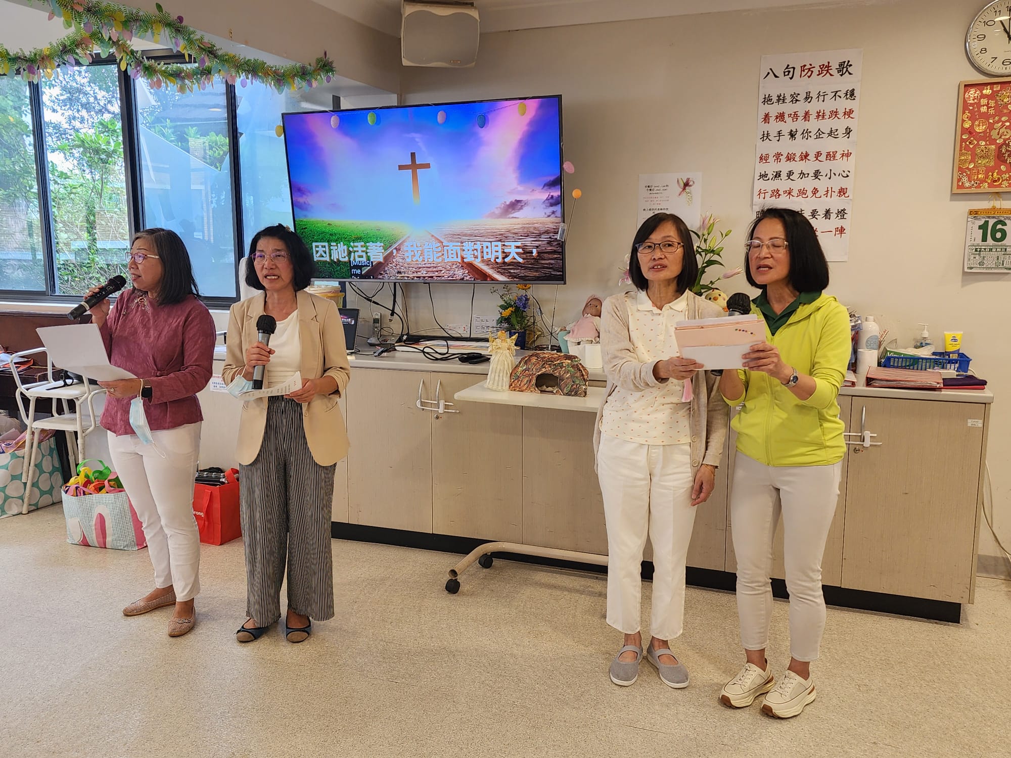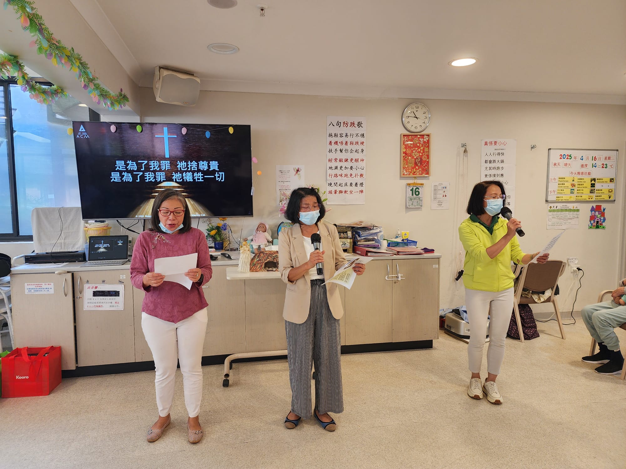 2025年4月16日 角聲和西雪梨華人基督教會探訪ANHF周藻泮療養院。六位姊妹盡心盡力為長者們帶領一個小時溫馨的活動。感謝神,院舍有二十多位長者出席這次活動,兩位姊妹帶領長者們做讚美操,長者們也積極跟著一起運動。運動過後,長者們可以細心欣賞一首福音粵曲。接著播放一個福音短片,讓長者們明白復活節真正的意義。黃金耀傳道分享復活節的信息,帶出主耶穌的復活讓我們重新省察自己人生,原來人在沒有選擇的人生中,在耶穌裡是有復活的選擇。回應詩歌“是為了我罪”讓大家明白在基督裡才有重生的生命。姊妹獻唱福音粵曲“重歸父恩情”更進一步鼓勵長者們打開心扉接受耶穌基督。之後弟兄姊妹領唱“因祂活著”讓長者們一同讚美仍然活著的主耶穌。最後在歌聲中,弟兄姊妹贈送每一位長者一份愛心禮物。