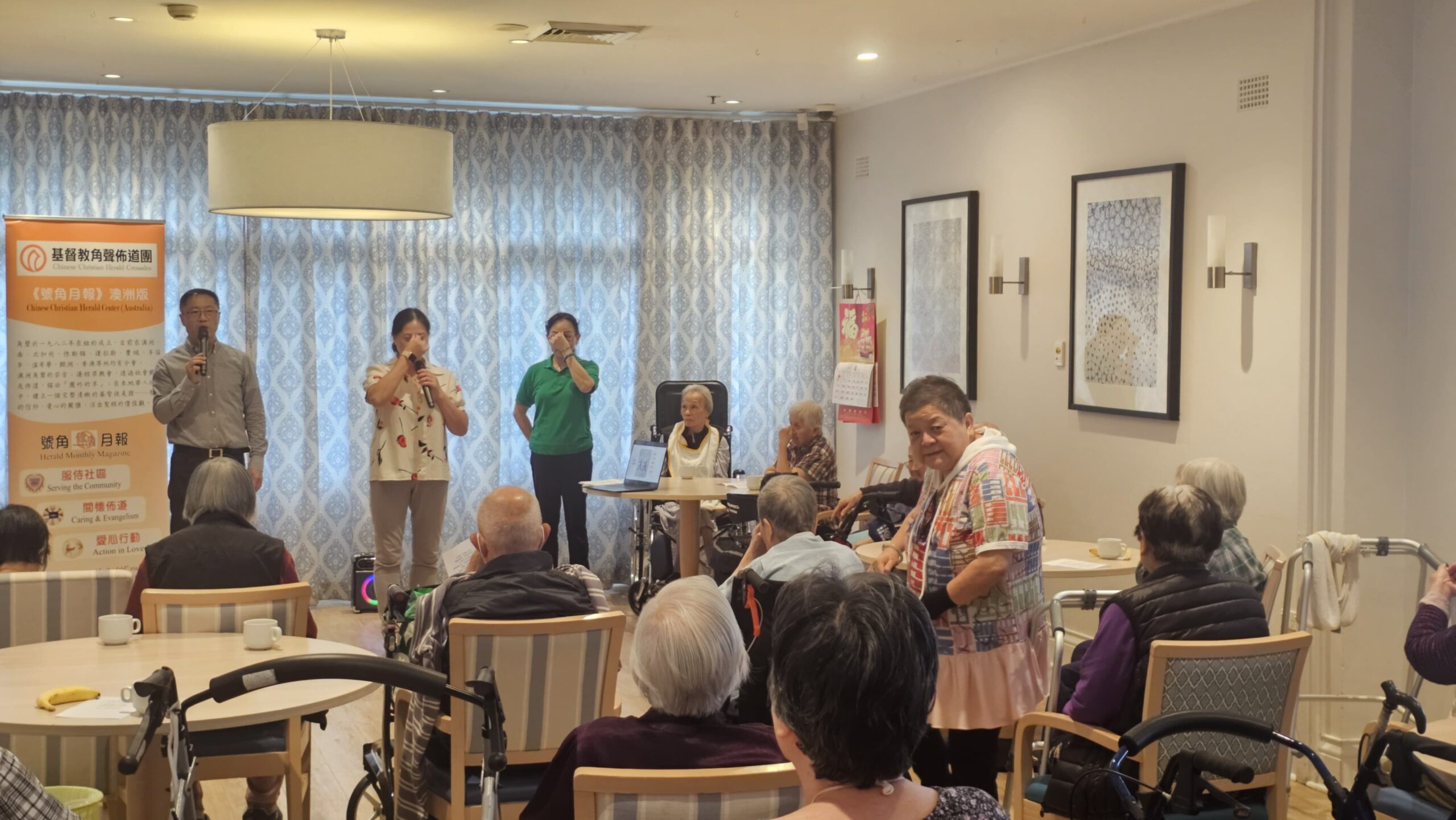 2025年4月23日 角聲聯同基督教百思道華人公理會的弟兄姊妹一行10人探訪團隊前往雪梨Harris Park 探訪Fairlea華人老人院,坐著輪椅或撑著助行器蹣跚到場的39位華裔長者,不時面露笑容,部份更邊喝著院舍特意炮製奶茶,與訪客閒談聊天,更有婆婆凝視場刊,看看訪客為她們帶來什麼佳音。院舍長者在同唱「為了我罪」、「醫治的愛」等詩歌的同時,有老人更表明多年前已經受洗成為基督徒。黄金耀傳道的信息鼓勵長者們接受耶穌基督,同復活,不用再害怕生老病死,因為在主裡有盼望,有新生命。探訪團隊為老人家準備的禮品包,長者都在細看著,為耶穌基督的福音埋下種子,有待發芽成長。